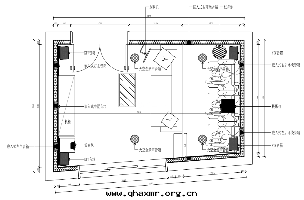 在(zài)前(qián)方(fāng)幕布(bù)後(hòu)方(fāng)設計(jì)空(kōng)腔設備間(jiān),影院(yuàn)主(zhǔ)音(yīn)箱(xiāng)、中(zhōng)置音(yīn)箱(xiāng)、低(dī)音(yīn)炮、KTV主(zhǔ)音(yīn)箱(xiāng)、以及(jí)機(jī)櫃(內(nèi)包(bāo)括日(rì)本(běn)天(tiān)龍功放(fàng)、藍(lán)光(guāng)機(jī)、媒體(tǐ)中(zhōng)心(xīn)、KTV點(diǎn)歌(gē)機(jī)、效果器、電(diàn)源时(shí)序器、智能(néng)總(zǒng)控),按照專業的(de)音(yīn)箱(xiāng)定(dìng)位(wèi),将設備隐藏在(zài)幕布(bù)後(hòu)方(fāng),除了(le)极(jí)大的(de)簡約美(měi)化(huà)空(kōng)間(jiān)外(wài),也(yě)能(néng)非常好(hǎo)的(de)保护設備不(bù)受外(wài)力的(de)損害。