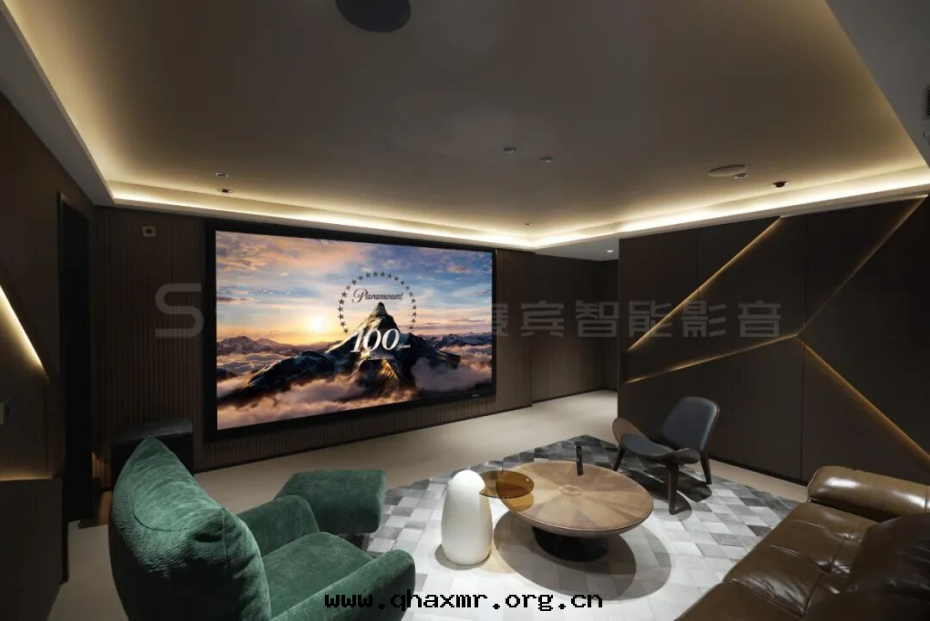 針(zhēn)对(duì)業主(zhǔ)的(de)个(gè)要(yào)求——要(yào)有(yǒu)足以匹(pǐ)配别墅簡約輕(qīng)奢格調的(de)顔值,設計(jì)师(shī)給(gěi)出(chū)了(le)令業主(zhǔ)滿意(yì)的(de)答(dá)案(àn)。整間(jiān)影音(yīn)室(shì)以深邃的(de)黑(hēi)咖色为(wèi)主(zhǔ)調,營造出(chū)沉穩而(ér)奢雅的(de)觀影氛圍。顶部(bù)點(diǎn)綴星空(kōng)燈(dēng),如(rú)同夜(yè)幕輕(qīng)落(là),散(sàn)发柔和(hé)的(de)光(guāng)影美(měi)感;牆(qiáng)面(miàn)以流动的(de)线性(xìng)燈(dēng)带(dài)切(qiè)割空(kōng)間(jiān),勾勒出(chū)未来(lái)感十足的(de)幾(jǐ)何輪廓。巨幅投影银(yín)幕与两(liǎng)側隐藏式音(yīn)響無縫融合,讓視听沉浸感倍增;前(qián)牆(qiáng)的(de)格栅設計(jì),既能(néng)起(qǐ)到(dào)一(yī)定(dìng)的(de)造型作(zuò)用(yòng),又能(néng)优化(huà)低(dī)頻和(hé)聲场(chǎng)均勻性(xìng)。宽(kuān)大柔软(ruǎn)的(de)沙(shā)发搭配低(dī)調的(de)現(xiàn)代(dài)茶(chá)幾(jǐ),为(wèi)觀影与放(fàng)松提(tí)供體(tǐ)验(yàn)。整體(tǐ)設計(jì)在(zài)光(guāng)影、材質(zhì)与比例之(zhī)間(jiān)取(qǔ)得完美(měi)平衡,既有(yǒu)影院(yuàn)级震撼,也(yě)具私享空(kōng)間(jiān)的(de)温(wēn)暖与格調。