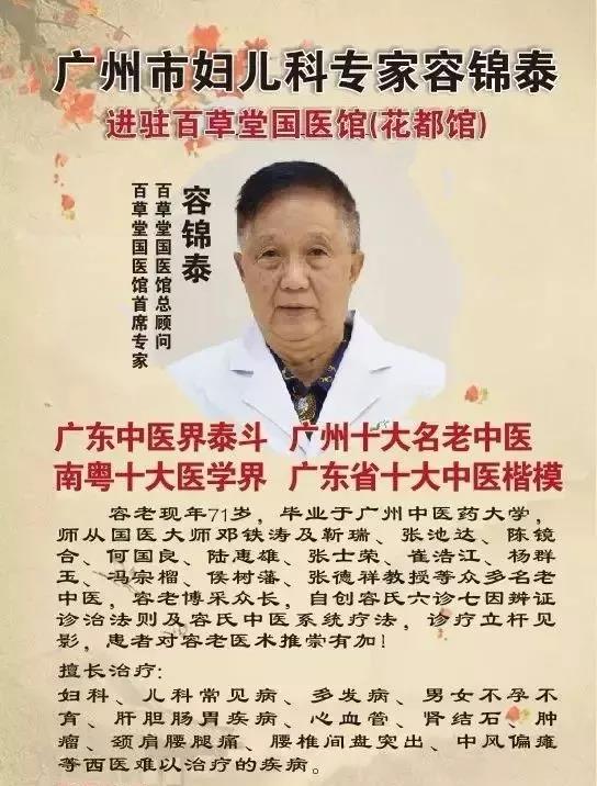每周日 09:30-12:00 14:00-17:00 ,容錦泰教授在百草堂國醫(yī)館(廣州越秀區(qū)人民中路)坐診,為患者治病解惑,弘揚中醫(yī)文化。
