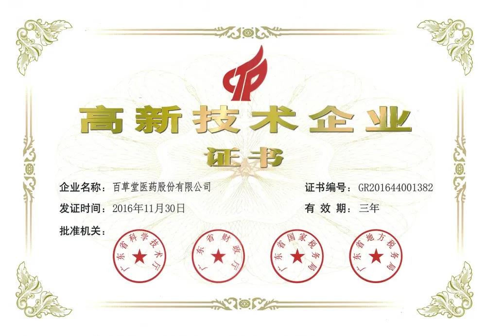 根據(jù)《科技部 財(cái)政部 國家稅務(wù)總局關(guān)于修訂印發(fā)〈高新技術(shù)企業(yè)認(rèn)定管理辦法〉的通知》(國科發(fā)火〔2016〕32號)和《科技部 財(cái)政部 國家稅務(wù)總局關(guān)于修訂印發(fā)〈高新技術(shù)企業(yè)認(rèn)定管理工作指引〉的通知》(國科發(fā)火〔2016〕195號)的有關(guān)規(guī)定,經(jīng)廣東省高新技術(shù)企業(yè)認(rèn)定管理工作領(lǐng)導(dǎo)小組辦公室組織認(rèn)定,并報(bào)全國高新技術(shù)企業(yè)認(rèn)定管理工作領(lǐng)導(dǎo)小組辦公室備案批復(fù)同意,百草堂醫(yī)藥股份有限公司被認(rèn)定為高新技術(shù)企業(yè),有效期:三年。批準(zhǔn)機(jī)關(guān)為:廣東省科學(xué)技術(shù)廳、廣東省財(cái)政廳、國家稅務(wù)總局廣東省稅務(wù)局。