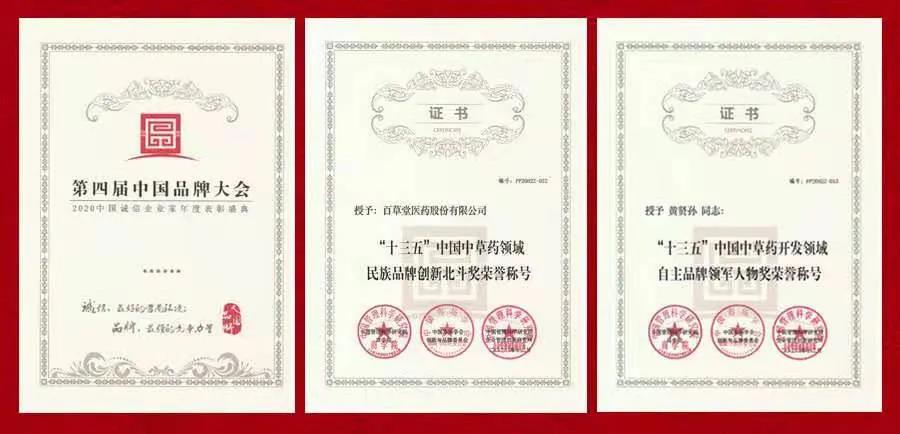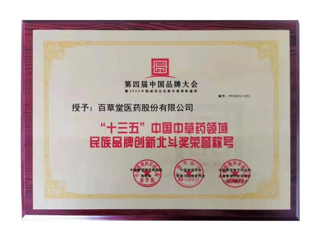 大會(huì)向?yàn)槲覈?guó)品牌強(qiáng)國(guó)建設(shè)和企業(yè)品牌建設(shè)做出突出成績(jī)的單位和個(gè)人頒發(fā)了獎(jiǎng)項(xiàng),百草堂醫(yī)藥股份有限公司獲得“十三五”中國(guó)中草藥領(lǐng)域民族品牌創(chuàng)新北斗獎(jiǎng),用實(shí)力贏得業(yè)內(nèi)認(rèn)可與尊重。同時(shí),百草堂醫(yī)藥股份有限公司董事長(zhǎng)、總經(jīng)理黃賢孫獲得“十三五”中國(guó)中草藥開發(fā)領(lǐng)域自主品牌領(lǐng)軍人物獎(jiǎng),以表彰他在推動(dòng)中草藥行業(yè)健康發(fā)展、技術(shù)創(chuàng)新、誠(chéng)信經(jīng)營(yíng)等方面所做出的突出貢獻(xiàn)。